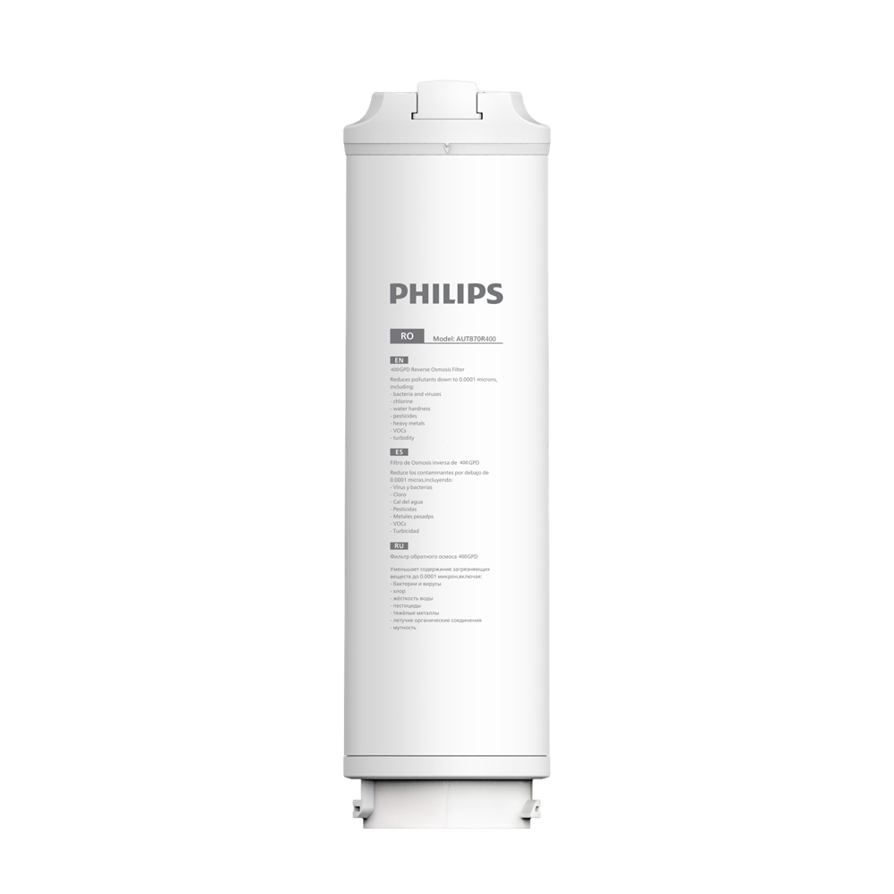 Фильтр с мембраной обратного осмоса 400 GPD. Удаляет загрязняющие вещества до 0,0001 микрон, включая до 99,99% бактерий и вирусов, хлор, известь, пестициды, антибиотики, тяжелые металлы, примеси.